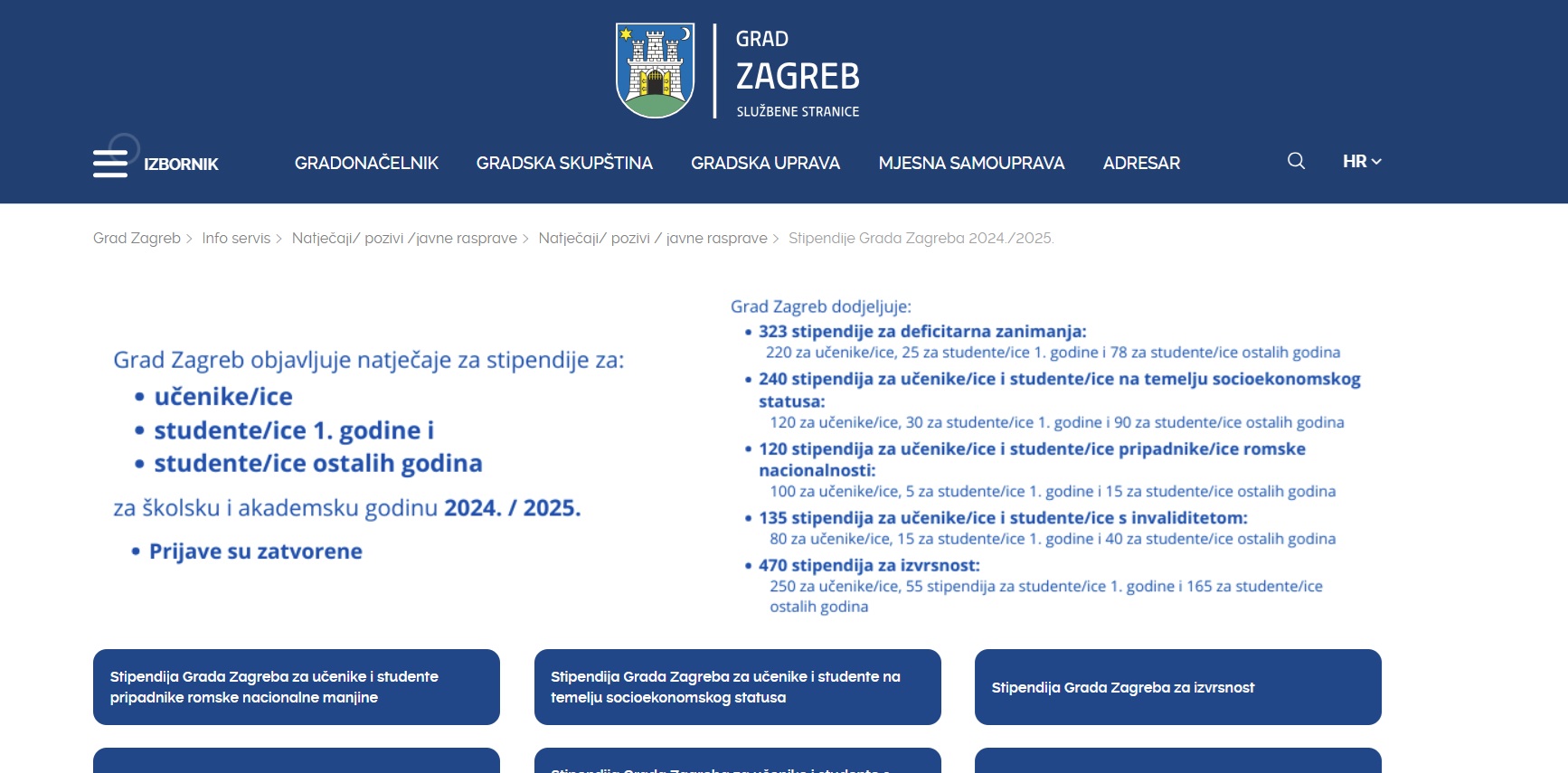 Stipendije grada Zagreba tekst Poštovani obavještavamo vas da su 30. rujna 2025., u 15,00 sati, na internetskoj stranici Grada Zagreba, www.zagreb.hr, objavljeni natječaji za dodjelu Stipendija Grada Zagreba učenicima za 2025./2026. školsku godinu. Molimo vas da informaciju o natječajima proslijedite učenicama i učenicima vaših škola koji ispunjavaju propisane uvjete, kako [...]