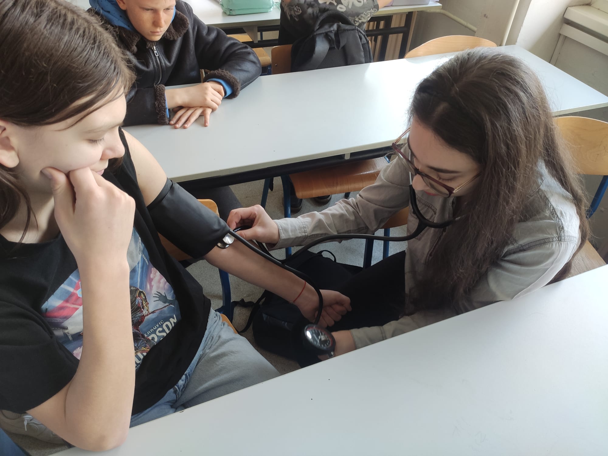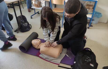 Edukacija na temu „Pomoć unesrećenom u vanbolničkim uvjetima“ okupila je znatiželjne učenike 6.b razreda, koji su s velikim zanimanjem pratili svoje starije kolege. Maturanti 5.c razreda kroz uvjerljive i pažljivo osmišljene simulacije prikazali su različite hitne scenarije te na jasan i pristupačan način podučili mlađe učenike osnovama pružanja prve pomoći. Poseban naglasak stavili su na pravovremeno prepoznavanje situacije i važnost pozivanja stručne pomoći — jer upravo brza i ispravna reakcija može spasiti život.